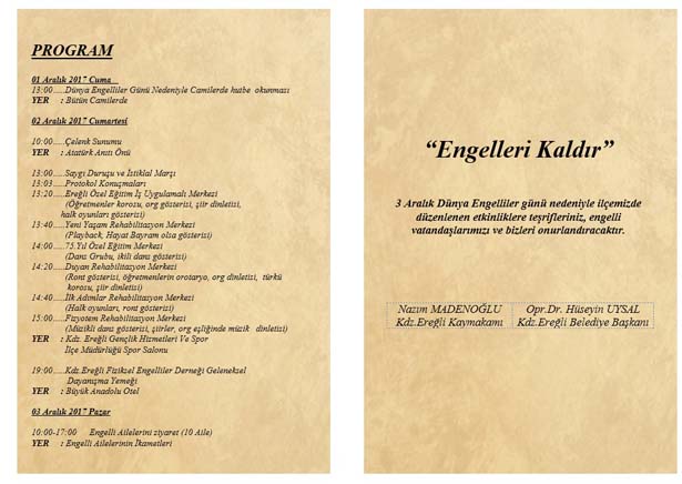 Karadeniz Ereğli Ereğli Kaymakamlığı ve Karadeniz Ereğli Belediyesi Sosyal Yardım İşleri Müdürlüğü ve organizasyonuyla gerçekleştirilecek olan '3 Aralık Dünya Engelliler Günü' çeşitli etkinliklerle kutlanacak.