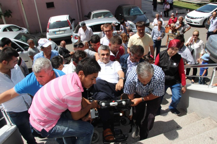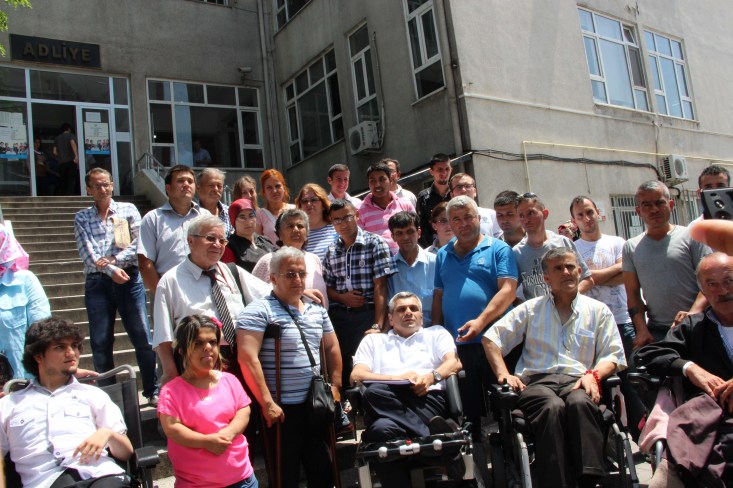 Fiziksel Engelliler Derneği Başkanı İsmail Şentürk, yaptığı konuşma sonrasında engelli çıkışı olmayan Adliye binasına yaklaşık 10 kişinin yardımı ile kucakta taşınarak girebildi. İkinci katta olan Savcılık odasına ise merdivenlerin dar olması sebebi ile çıkamadığını kaydeden Şentürk, avukatının savcı ile görüşmeye gittiğini ve görüşme sonucunu bekleyeceklerini söyledi.
