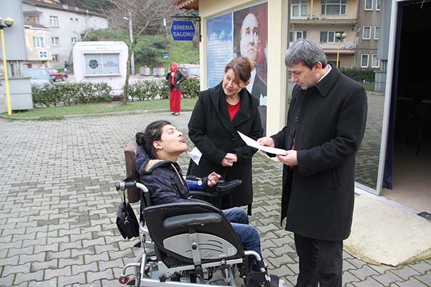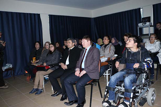 Film öncesinde engelli gençler ve aileleri salonda yerini alırken, engelli gençlerden Yasin Çiçek, Belediye Sosyal İşler Müdürü Baki Kara'ya engellilerin istekleri ve taleplerini içeren bir yazı iletti.