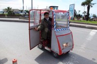 zorlanan 83 yaşındaki Bayrak Tekce, Antalya' dan aldığı akülü arabasının üstüne