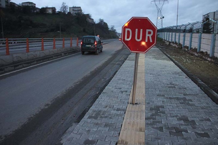 Zonguldak'ın Ereğli ilçesinde, görme engelliler için döşenen taşların ortasına koyulan "Dur" levhası kaldırıldı.