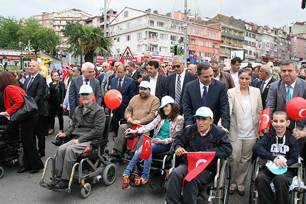 "İnşallah birgün Kdz Ereğli'de engelli olimpiyatları olana kadar hedefler koyduk. Bir gün bu hedeflerin gerçekleşme ihtimali olacağını düşünüyorum. Yeter ki o hedefe inanın. Biz şunu biliyoruz. Engelli vatandaşlarımızın yüzde 12-14 arasında bir oranı var. Bunun annesi, babası, babaannesi, dedesi, amcasıyla, teyzesiyle düşündüğünüz zaman belki ülkemizin belki yüzde ellisi engelli veya engelli yakınıdır.Engelli tanımını da yenilememiz gerek. Otizm de bir engelli, görme engelleri, yaşlılık da engeldir. Engel normal bir insanın yapacağı hareketleri birileri yardımıyla yapandır. O zaman hamileye bile pozitif ayrımcılık gösterirsiniz, Baston kullanana bile pozitif ayrımcılık yaparsınız. Sokağa çıkmakta bireylerin sıkıntı çektiği bir yerden bugünkü araçlarla sokağa çıkılan bir noktaya geldik. Bir anne buraya gelirken 'Ne kadar mutluyum' dedi. Benimle arabasını itmekten dolayı değil, çocuğunun arabayla o caddede yürümesinden dolayı mutlu. Demek bize bir görev daha düşüyor. Yollarımızı engelli vatandaşlarımızın, yaşlılarımızın kullanacağı şekilde yaya kaldırımları, yaya yoları yapmamız lazım.Yolar insanlar içindir. Araçlar için değildir. İnşallah önümüzdeki yılarda engelli vatandaşımız ailesiyle birlikte indiği zaman bütün şehirde kendi başına dolaşabilecek. Hedef bu olmalı. Gerek devlet kurumunda, gerekse özel sektörde, kafede, sinemada, her yerde aile sıcaklığının olduğu ortamda yaşamanın kolaylığını onlara da sağlamamız lazım. Bizler nasıl yaşıyorsak, engelli kardeşlerimiz de aynı şekilde aynı ortamda yaşamalı. Ayrı ortam ayrıştırmaktır. Bizler ayrıştırmaya değil birleştirmeye geldik. Bizim gittiğimiz sahilde, kafede bu kardeşlerimiz de olmalılar olacaklar."