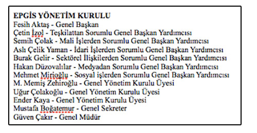 EPGİS'in kurucu yönetim kurulu da belirlendi. Fesih Aktaş'ın Başkanlığı'ndaki yönetim kurulunda, Çetin İzol, Semih Çolak, Aslı Çelk Yaman, Burak Gelir, Hakan Düzovalılar, Mehmet Mirioğlu Genel Başkan Yardımcılıklarını üstlendi. Diğer Genel Yönetim Kurulu üyeleri ise M. Memiş Zehiroğlu, Uğur Çolakoğlu ve Ender Kaya olarak sıralanıyor. EPGİS'teki profesyonel idari kadro ise Genel Sekreter Mustafa Boğatemur ve Genel Müdür Güven Çakır'dan oluşuyor.