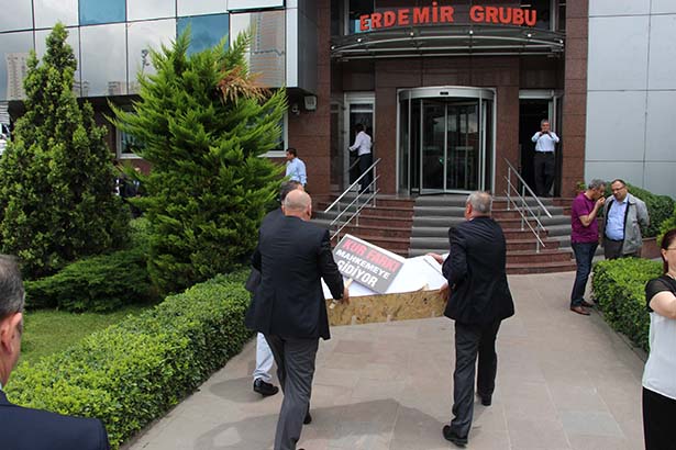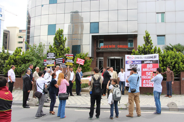 İstanbul Ataşehir'de Erdemir Ofisi önünde bugün sac tüccari,sanayici ve nakliyecilerden oluşan 20 kişilik grup eylem yaptı.