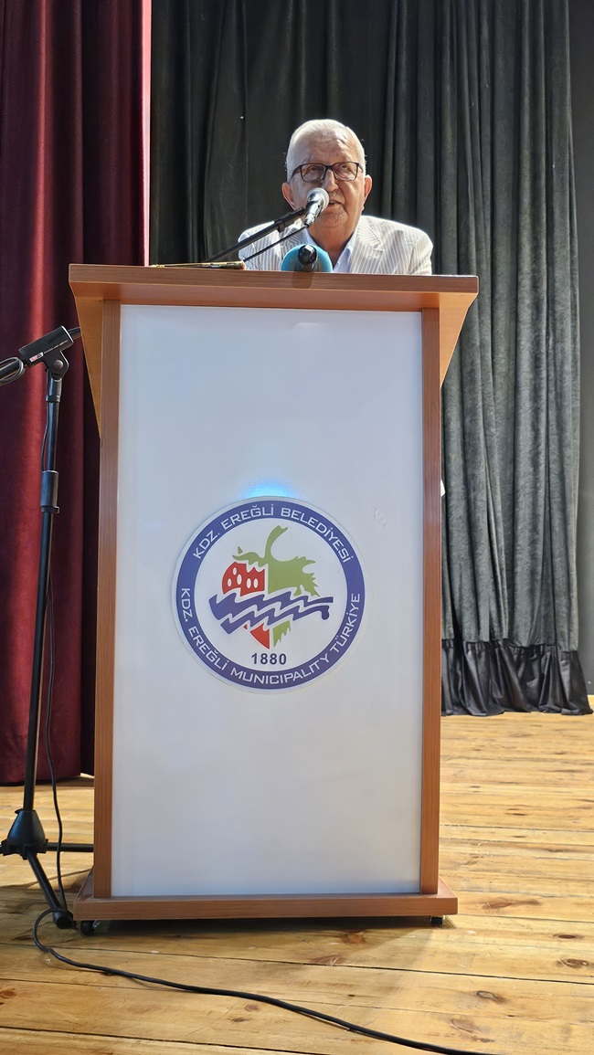 “Ereğli son zamanlarda sıkıntılı günler geçiriyor. Ereğli’nin adeta üzerini kara bulutlar kapamış vaziyette. Evet, bu işlere pek girmek istemiyorum ama gerçekten Ereğli çok sıkıntılı günler geçiriyor. Endüstriyel bölgesi, tasarruf genelgesi Ereğli’yi iyice bitirme yolunda. O sıkıntılı günler içerisinde, sizlerle beraber olduğumuz saatlerde bir aydınlık anı olarak, sevinç anı olarak değerlendiriyorum. Çünkü; büyük adamların, çok para kazananların, Ereğli’yi soyanların bir kuruş bile takıma destek vermediği, futbolu sıfırlamayı çalıştığı bir ortamda, Ereğli’deki bir takım delikanlılar çıkıp, Ereğli için biz elimizi taşın altına koyarız deyip bu kulübü yaşatmak fedakarlığında bulunan ve onları hep destekleyen başka futbol severler Genç Ereğliler Derneğimiz bir an olsun bizleri bırakmayan, basın mensuplarımıza, bu anı bizlere yaşatanlara, maddi manevi hiçbir sıkıntıdan çekinmeyen, “biz Ereğli için varız, ekmeğimizi Ereğli’den kazanıyoruz, Ereğli’nin havasını teneffüs ediyoruz” deyip ortaya çıkan çok değerli dostlarımız şuan da sıkıntılı günler geçiren Ereğli’de bugün parlak bir ışık gibi Ereğli’ye yansımaya başladılar.