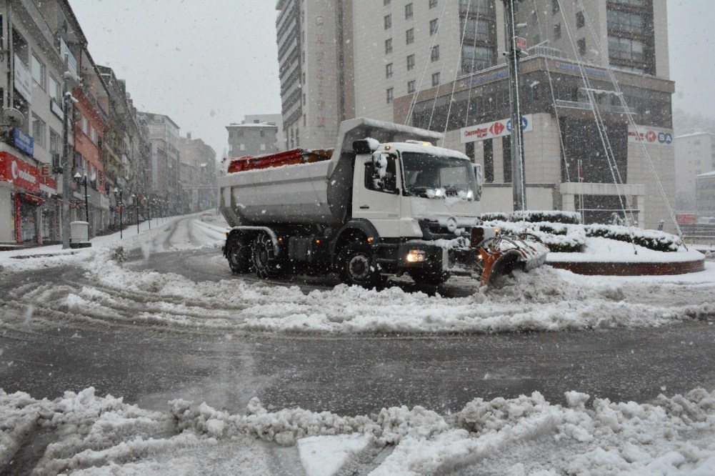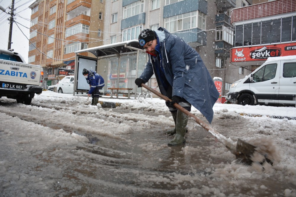Gece yarısından itibaren şehir merkezinde de etkisini artıran kar yağışına karşı Kdz. Ereğli Belediyesi Fen İşleri Müdürlüğü, Su ve Kanalizasyon, İtfaiye, Temizlik İşleri, Zabıta başta olmak üzere bütün birimler ana arterler ve ara yollarda temizlik çalışmalarını sürdürüyor.