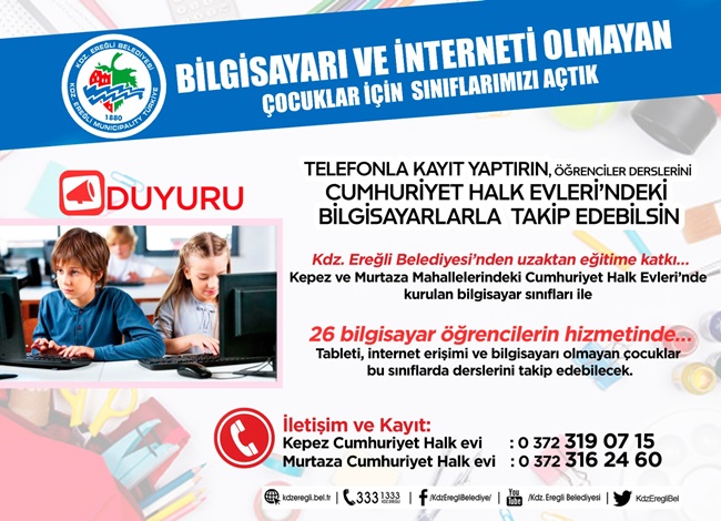 Kdz. Ereğli Belediyesi, uzaktan eğitime katkı vermek için Cumhuriyet Halk Evleri’ndeki bilgisayar sınıflarını, bilgisayarı ve interneti olmayan çocuklara tahsis etti.