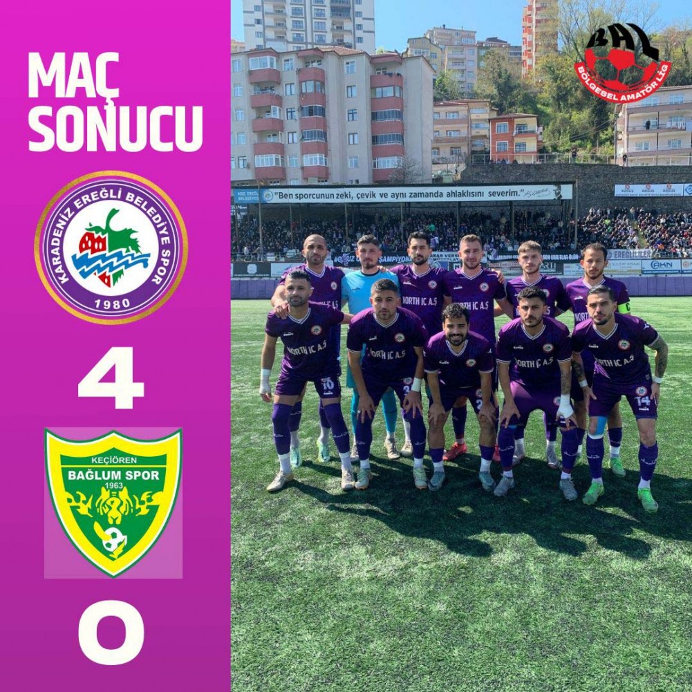 Bölgesel Amatör Ligde, bitime 5 hafta kala şampiyonluğunu ilan eden Kdz.Ereğli Belediyespor, 27. Hafta karşılaşmasında sahasında konuk ettiği Keçiören Belediyesi Bağlumspor'u 4-0 yendi.