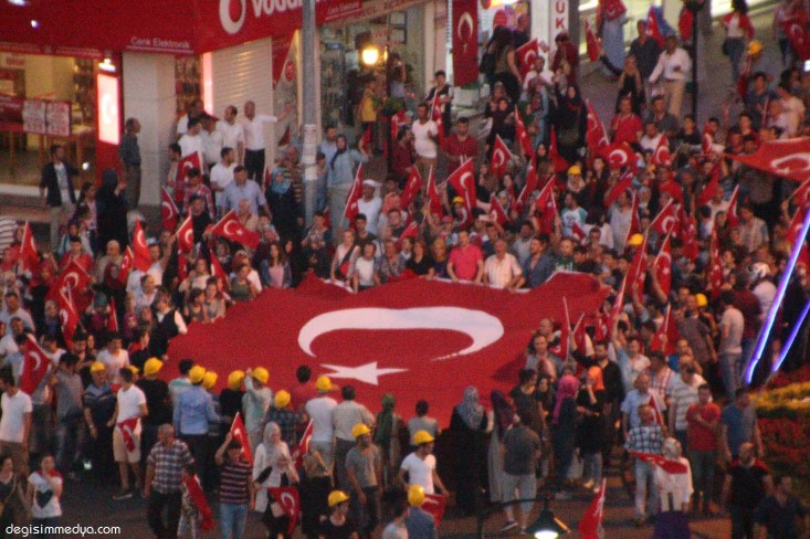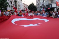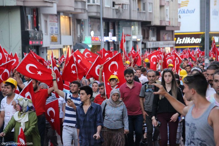 Zonguldak'ın Ereğli ilçesinde darbe girişimine karşı demokrasi yürüyüşü düzenlendi. Yaklaşık 2 kilometre ellerinde bayraklarla yürüyen binlerce kişi tekbirlerle sloganlar attı.