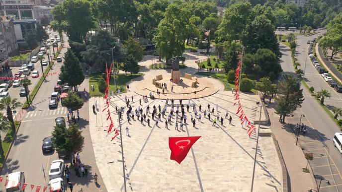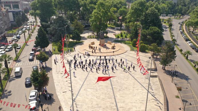 Atatürk Anıtı önündeki programı dronla takip eden Karadeniz Ereğli Emniyet Müdürlüğü Ekipleri alanın yukarıdan çekilmiş fotoğraf ve video görüntülerini basın mensuplarıyla paylaştılar.