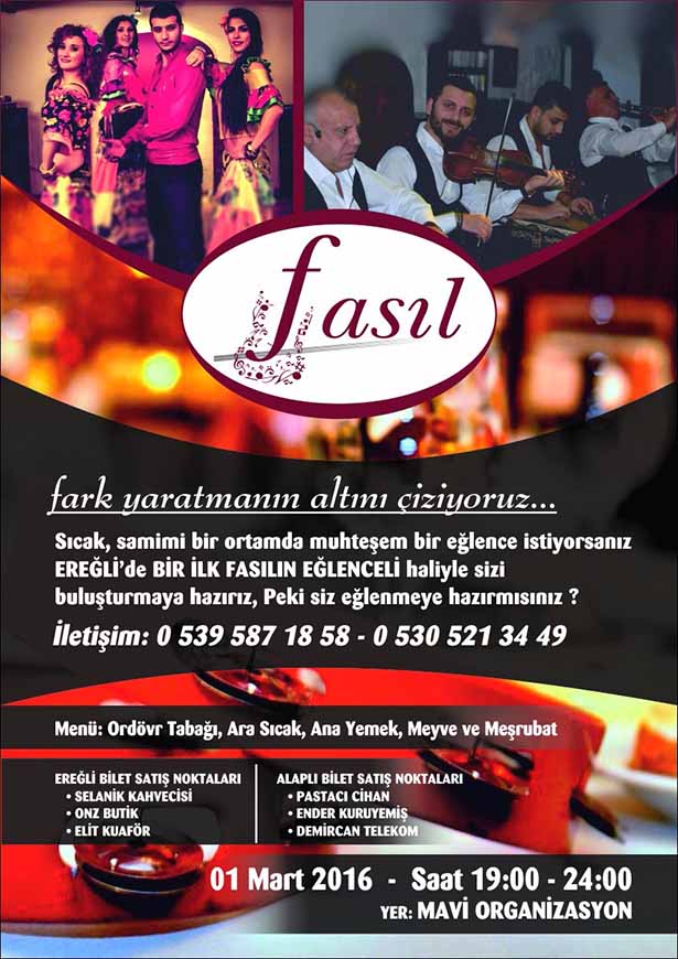 1 Mart Salı günü akşam saat 19.00'da Mavi Organizasyonda gerçekleştirilecek olan Fasıl Gecesi'ni kaçırmayın. Doyasıya müzik ve fasılın keyfine varacağınız bu gecede keyifli bir akşam yemeğine de sahip olacaksınız.