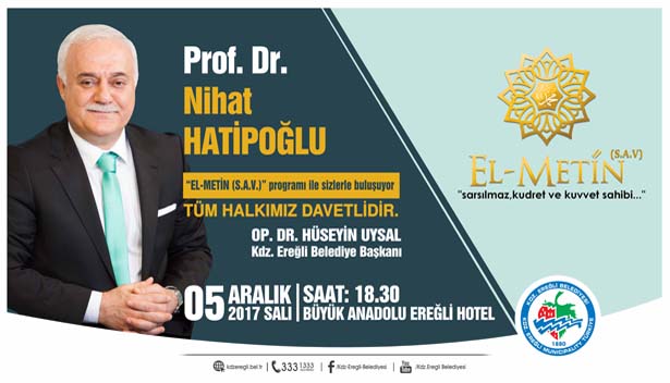 05 Aralık 2017 Salı günü saat 18.30'da Büyük Ereğli Anadolu Otel'de yapılacak olan 'El Metin (S.A.V)' adlı konferansta, Hatipoğlu, Peygamber Efendimiz Hz.Muhammed'in (S.A.V) hayatını anlatacak.