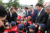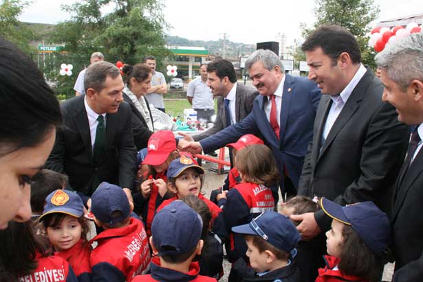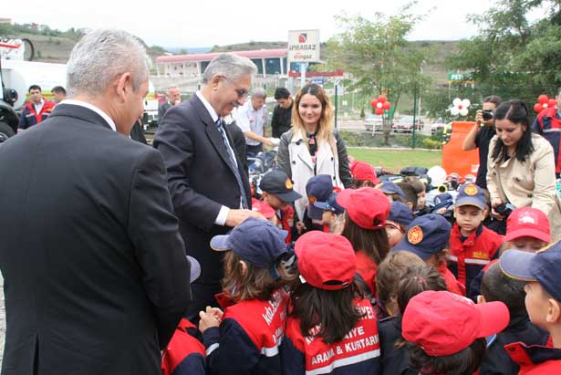 Protokol üyeleri açılış öncesinde alanda bulunan, itfaiye ve zabıta giysileri giymiş kreş öğrencileri ile sohbet edip, itfaiye ve yangın hakkında sorular sordu.