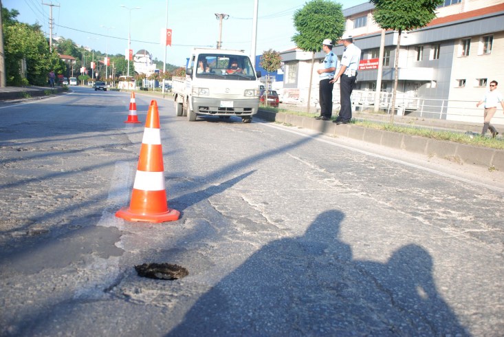 Karadeniz Ereğli'de karayolunda 1 metre derinliğinde çukur açıldı. Açılan çukur nedeniyle kaza yaşanmaması için polis yolda işaretleme yaparak önlem aldı.