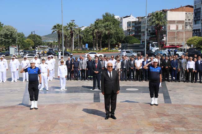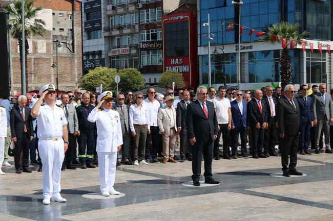 Devrim Bulvarı Anıt Park'ta dğüzenlenen ilk törende, Atatürk Anıtı’na Kaymakamlık, Garnizon Komutanlığı, Belediye Başkanlığı ve Liman Başkanlığı çelenkleri sunuldu. Ardından sirenler eşliğinde saygı duruşunda bulunularak, İstiklal Marşı söylendi.