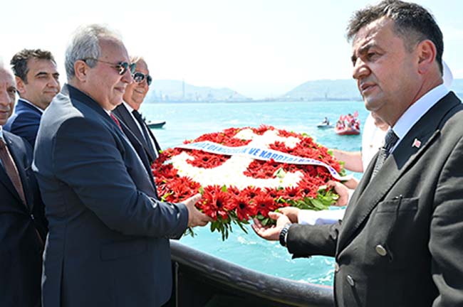 Törenin ardından Deniz Şehitleri anısına denize çelenk bırakıldı, Erdemir Römorkörleri de su püskürttü.