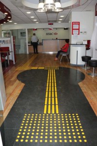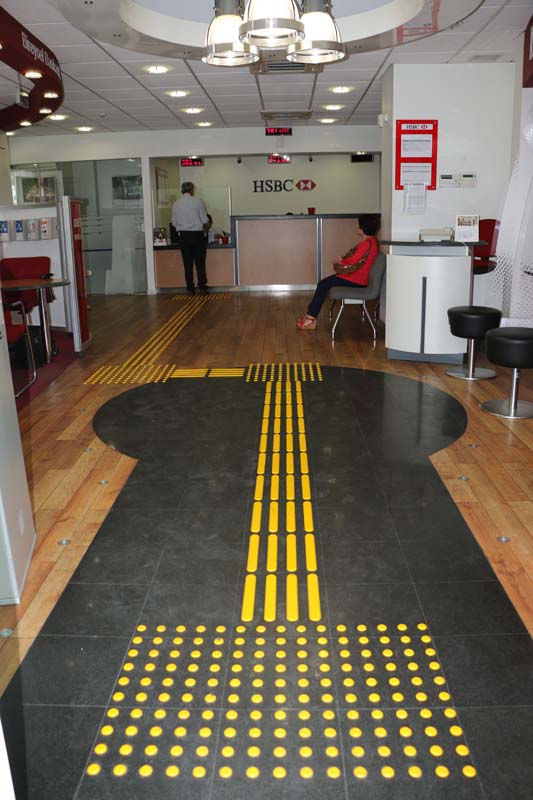 HSBC Bank Ereğli Şubesi'nde başlayan hizmet görme engelli vatandaşların ayakları ve bastonla algılayabilecekleri yol aracılığıyla bina giriş çıkışlarında ve hizmet alanlarına kolaylık sağlayacak.