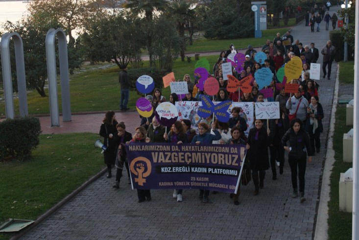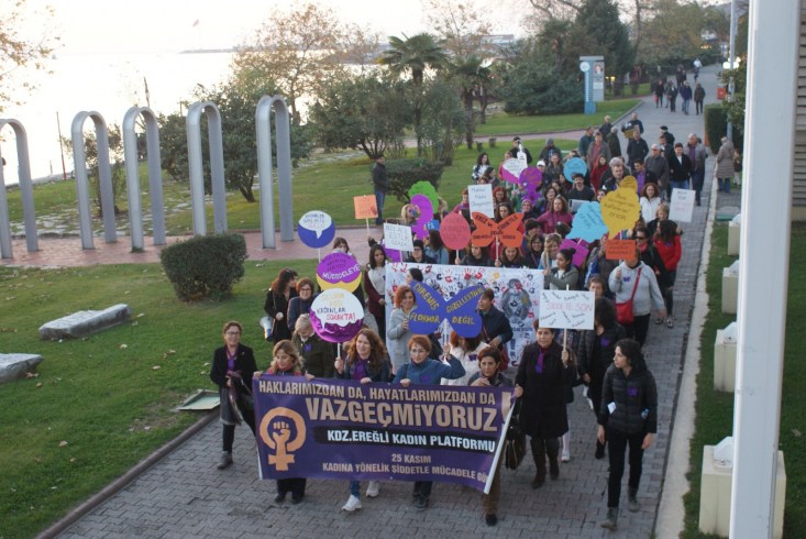 Ereğli Kadın Platformu üyesi kadınlar Bozhane Mevkii'nde bir araya gelerek başlattıkları yürüyüşü kadın dayanışmasını ve kadına yönelik şiddeti reddeden sloganlar atarak sahil yürüyüş yolu boyunca sürdürerek Devrim Bulvarı'ndaki Atatürk Anıtı önünde sonlandırdılar.