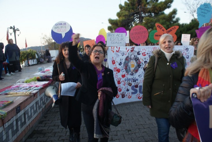 Dünya ekonomik forumu küresel cinsiyet uçurumu raporuna göre Türkiye'nin 140 ülke arasında 131. sırada olduğunun altını çizen Aydın, "Kadın erkek eşit değildir! diyen zihniyet bunu yeterli görmüyor olacak ki kadın düşmanı politikalarıyla , kazanılmış haklarımıza dönük saldırılarla var olan eşitsizliğiher geçen gün daha da derinleştiriyor. Her üç kadından biri şiddetin en az bir biçimde maruz kalıyorken, şiddeti önlemek için daha etkin mekanizmalar oluşturmak yerine.8284 No'lu Ailenin Korunması Ve Kadına Karşı Şiddetin Önlenmesi Yasasını kaldırmaya çalışıyorlar. Oysa bu yasa uygulamadaki sıkıntılara rağmen şiddeti önlemeye dair elimizdeki tek yasadır. Mecliste boşanmayı önleme komisyonu aracılığıyla hazırlatılan yüzlerce sayfalık raporla kadının aile içinde uğradığı şiddeti meşrulaştırmaya çalışıyorlar. İstanbul Sözleşmesi başta olmak üzere imzalanan uluslararası sözleşmelerin gereğini yerine getirmeyenler, en son olarak nafaka hakkına göz diktiler. Kadın erkeğe, aileye daha fazla bağımlı olsun hesaplarını yapanlara bugün buradan cevap veriyoruz: haklarımıza ve hayatlarımıza sahip çıkacağız, köle olmayacağız" dedi.