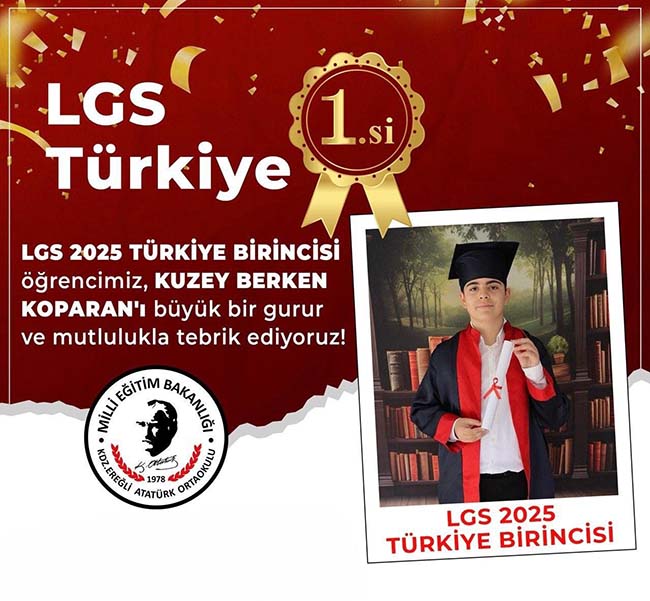 Kdz. Ereğli Atatürk Ortaokulu öğrencisi Kuzey Berken Koparan, 2025 LGS kapsamında açıklanan resmi sonuçlara göre, 500 tam puan alarak, Türkiye birincisi oldu.