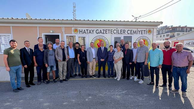 Hatay Valisi Mustafa Masatlı’yı ziyaret eden Erkılınç, Hatay Gazeteciler Cemiyeti’nin geçici olarak faaliyet gösterdiği prefabrik işyerinde süreli yayınların temsilcileriyle buluştu.