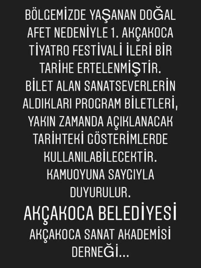 “İlçemizde yaşanan doğal afet nedeniyle 19 - 21 Temmuz tarihlerin de gerçekleştirilecek olan 1.Akçakoca Tiyatro Festivali ileri bir tarihe ertelenmiştir. Sanatseverler aldıkları program biletlerini, yakın zaman da açıklanacak tarihteki gösterimlerde kullanabileceklerdir. Kamuoyuna saygıyla duyurulur.”