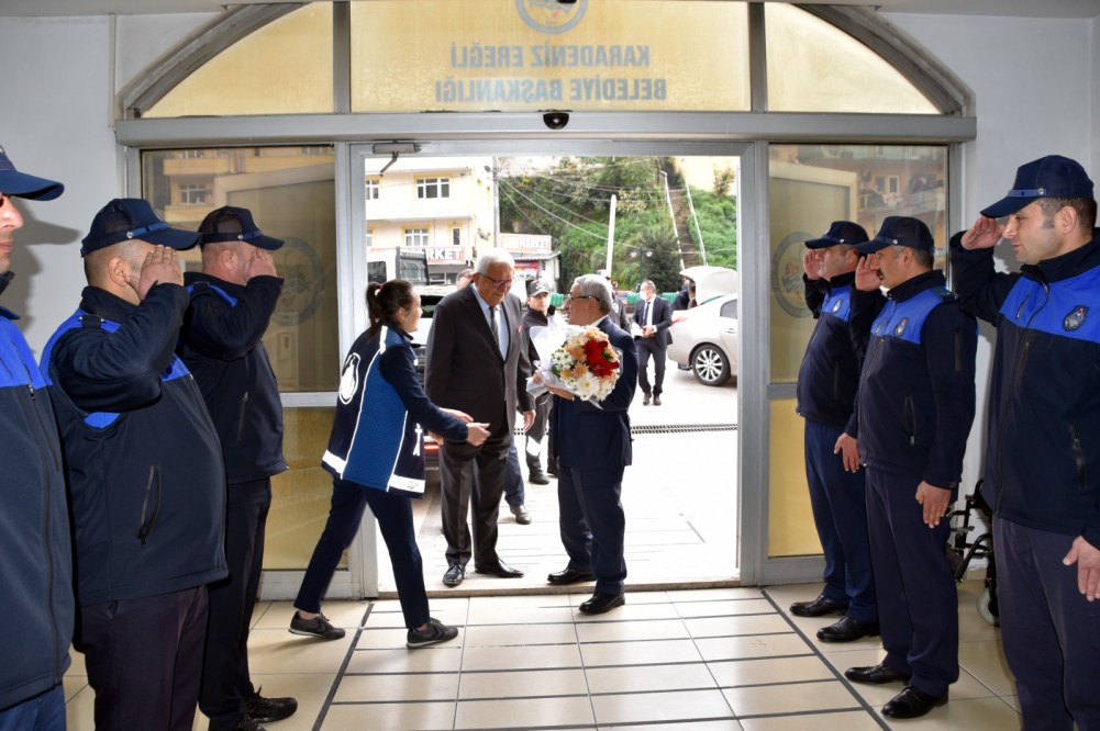 Kdz. Ereğli Belediye Başkanı Halil Posbıyık, Eski Deniz Kuvvetleri Komutanı Oramiral Metin Ataç’ı, beraberinde başkan yardımcılarıyla birlikte zabıta karşılama mangası eşliğinde belediye binası girişinde karşıladı.