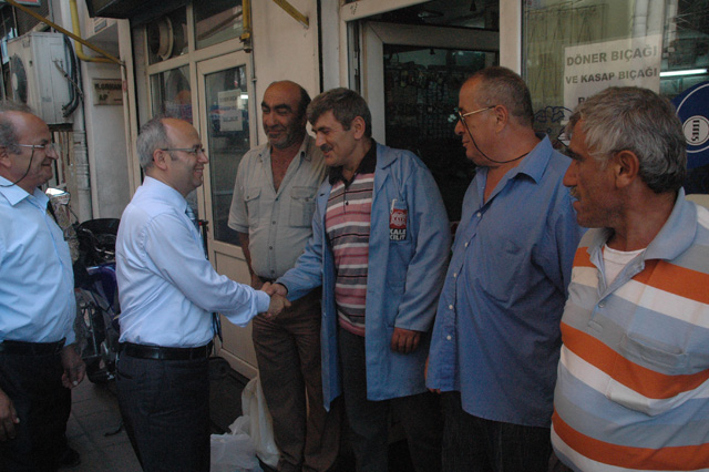Çarşı merkezinde esnafları ziyaret eden Ercan Candan ve beraberindekiler, eşraf ile tek tek sohbet edip sorunlarını dinlediler.