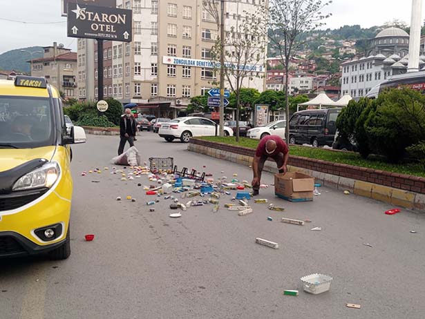 Zonguldak'ta sosyete pazarından tezgahını toplayarak yola çıkan esnafın aracının kapağı açılınca mallar yola döküldü.
