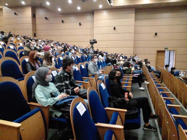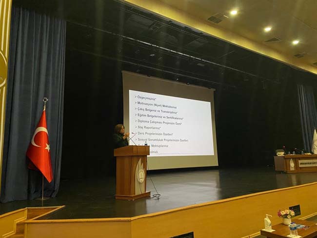 Öğrencilerin dikkatle dinlediği sunumda kariyerlerinin başlangıcı için son derece önemli olan özgeçmiş hazırlama ve mülakat tekniklerini anlatmanın yanı sıra Hacıoğlu, öğrencilerin üniversite döneminde kendilerini geliştirmek adına sertifikalı profesyonel eğitim ile donanım kazanmaları ve kendi uzmanlık alanları dışında da kendilerini geliştirmeleri konusunda bilgilendirdi.