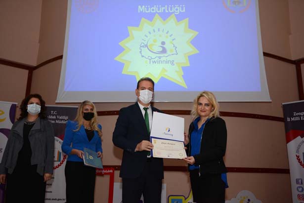 Törende 77 öğretmen ve 46 okulumuz ödül alırken, bu yıl eTwinning Türkiye Özel Ödüllerinde 10 bin 768 proje arasından Eba Kategorisi Türkiye 1. olan English Beyond Ability (EBA) projesinin ödül belgeleri, proje kurucusu eTwinning Zonguldak İl Koordinatörü ve Prof. Dr. Ş. Teoman Duralı Bilsem İngilizce Öğretmeni Mehtap Öz ile proje ortağı İbrahim Fikri Anıl Ortaokulu İngilizce Öğretmeni Beçin Balcı ‘ya Zonguldak İl Milli Eğitim Müdürü Sayın Ali Tosun tarafından verildi.