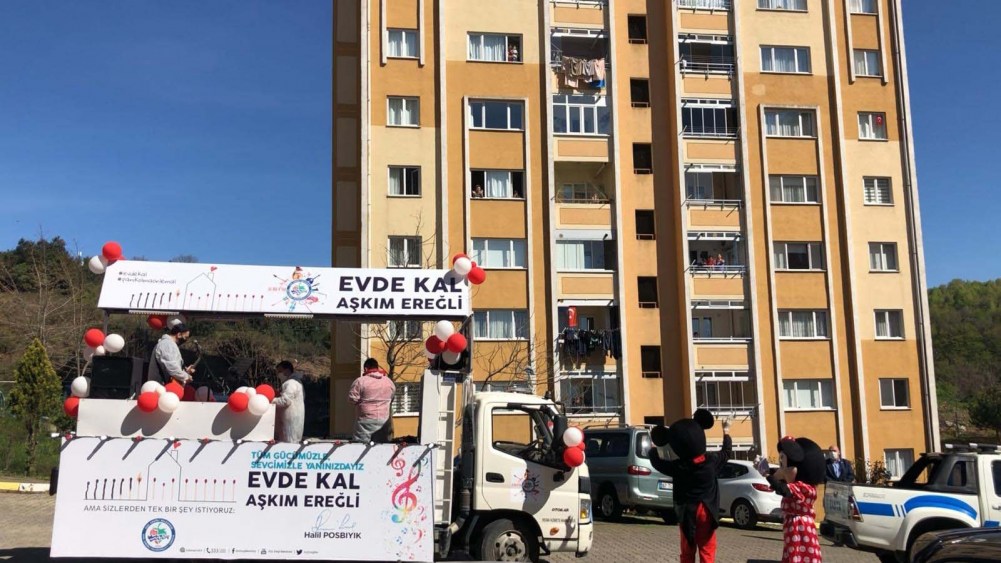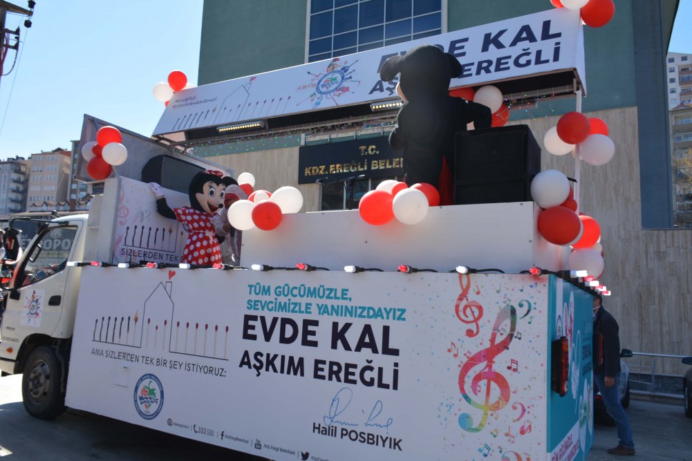 Koronavirüs salgınına karşı seferber olan Kdz. Ereğli Belediyesi, evlerinde kalan çocukları ve aileleri düşünerek yeni bir uygulama başlattı. Canlı müziğin yapılacağı ve maskotların balkonlardaki, pencerelerdeki çocukları eğlendireceği ‘Evde Kal Aşkım Ereğli’ aracı yollara çıktı.