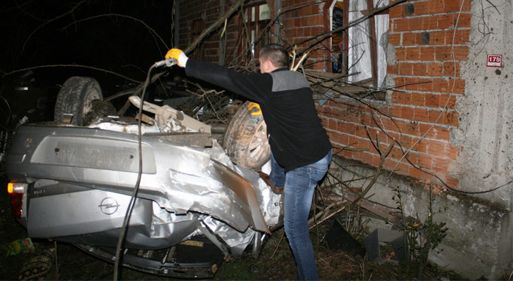 Edinilen bilgilere göre, Düzce'nin Çay Mahallesi Aydınpınar Caddesi'nde N.K. idaresindeki 81 BG 411 plakalı otomobil, sabah saat 05.00 sıralarında hızla giderken, önüne çıkan köpeğe çarpmamak için sürücünün direksiyonu kırmasıyla takla attı. Takla atan otomobil, Ali Kaygısız'a ait tek katlı evin duvarına çarparak durabildi. Çarpmanın etkisiyle evin camları kırılırken, ağaçların dalları ise evin içerisine girdi. Kaza sırasında evde uyuyan hane halkı, deprem oluyor zannederken, hurda yığını haline gelen otomobilde bulunan N.K. ise, arkadaşları tarafından getirilen başka bir araca bindirilip olay yerinden götürüldü.