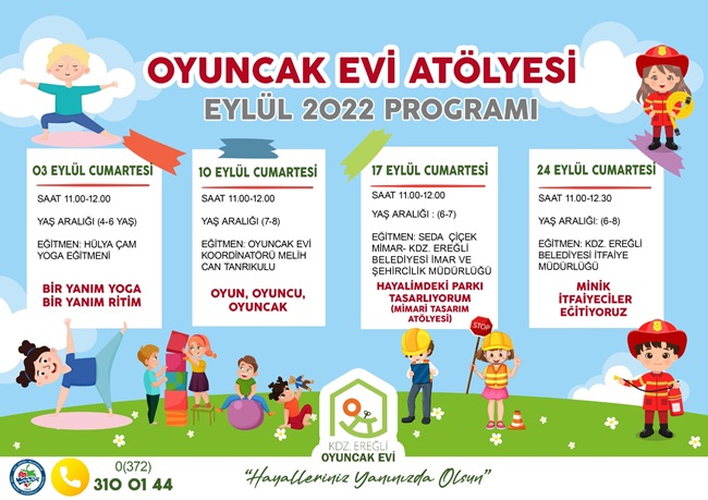 Yaz döneminde kısa bir süre atölye çalışmalarına ara veren Kdz. Ereğli Belediyesi Oyuncak Evi’nin Eylül ayı programı açıklandı. Atölye çalışmalarında; “Bir Yanım Yoga, Bir Yanım Ritim”, “Oyun, Oyuncu, Oyuncak”, “Hayalimdeki Parkı Tasarlıyorum”, “Minik İtfaiyeciler Eğitiyoruz” atölyeleri çocukları bekliyor.