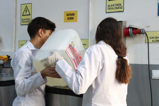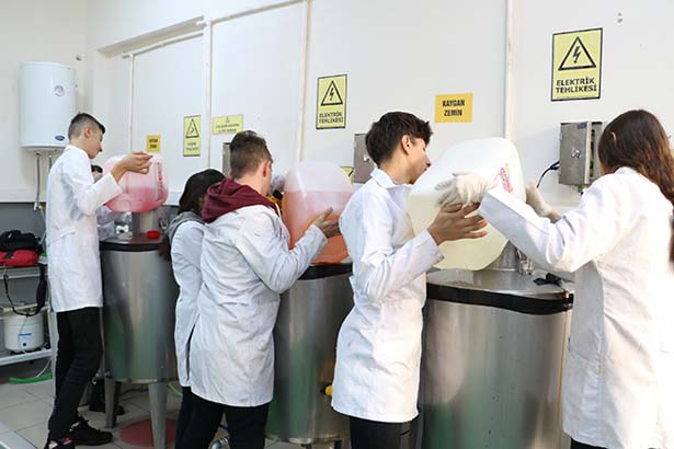 Dört türde deterjan ürettiklerini belirten Kimya öğretmeni Ayşe Çiçek Yıldız, “Burada öğrencilerimizle dört türde deterjan yapıyoruz. Sıvı sabun, çamaşır suyu, yüzey temizleyici ve köpüklü sıvı sabun yapıyoruz. Öğrencilerimize ilk başta nasıl yapılacaklarını öğrettik. Numuneler hazırladık. Sonrasında da 200 litrelik kazanlarda öğrencilerimiz bu karışımları hazırlıyorlar. Hem bu konuyu da öncesinde gördükleri için kullanmış oluyorlar. Aynı zamanda döner sermayeden belli bir ücret alıyorlar. Emeklerinin karşılığını da alıyorlar. Bir meslek öğrenmiş oluyorlar. Burayı bitirdiklerinde zaten bizim de amacımız inşallah bu alanla ilgili bir yerde çalışabilecekler. Çünkü öğrenerek mezun olacaklar” şeklinde konuştu.