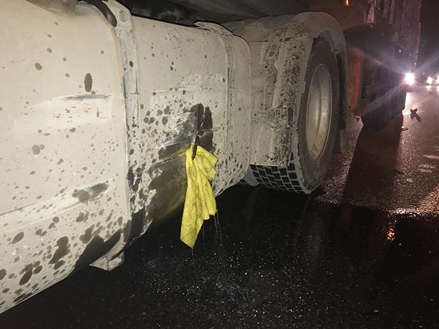 Sürücü ve yanındakiler kamyonda bulunan bidonlar ile çevre
