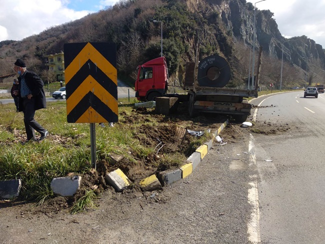 Kaza saat 13,30 suların da Ereğli Alaplı karayolu Mevrealtı mevkiinde meydana geldi. Alınan bilgilere göre Ereğli’den Alaplı’ya giden Erdoğan U. İdaresindeki 41 F 4494 çekici 81 EP 793 plakalı TIR, direksiyonunun kilitlenmesi sonucu kontrolden çıkarak çıktığı refüjde elektrik direğine çarparak durabildi. Kazada sürücü Erdoğan U. Kazayı yara almadan atlatırken, kaza sırasında yolun boş olması olası bir faciayı önlemiş oldu. Çekicinin kurtarıldığı kazada dorsenin üzerinde ki sacın alındıktan sonra dorsenin de kaza yerinden kaldırılacağı öğrenildi.