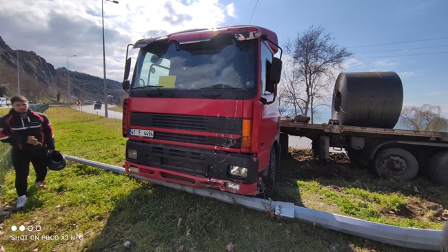 Zonguldak’ın Ereğli ilçesinde direksiyonu kilitlenen TIR çıktığı refüjde elektrik direğine çarparak durabildi. Yaralananın olmadığı kazada faciadan dönüldü.