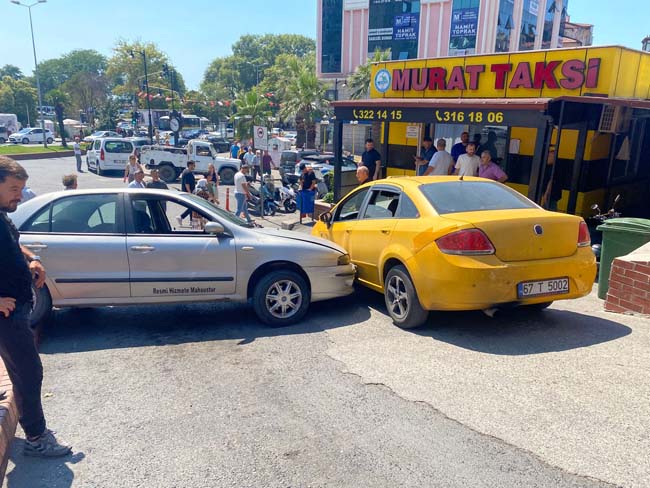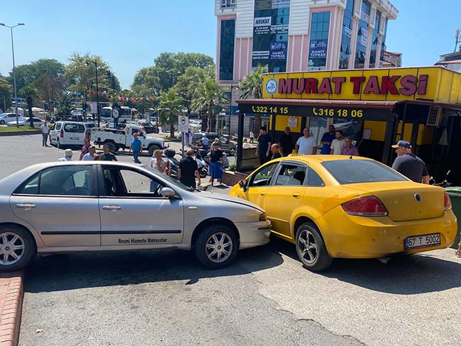 Zonguldak’ın Ereğli ilçesinde meydana gelen trafik kazasında frenleri boşalan otomobil ticari taksiye çarparak durabildi.