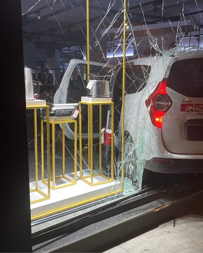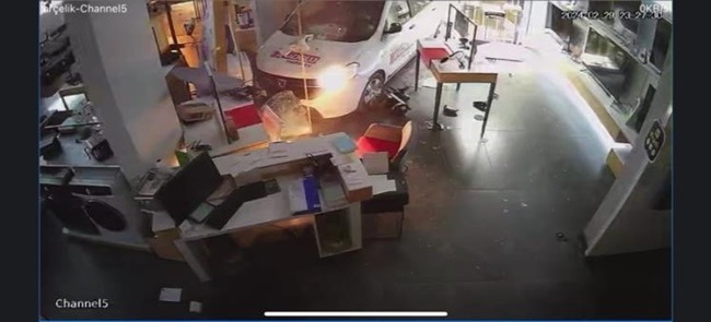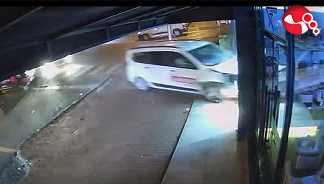 Edinilen bilgiye göre, Engin U. idaresindeki 34 DYC 826 plakalı hafif ticari araç caddede seyir halindeyken ters istikametten yola çıkmaya çalışan S.D. iaresindeki plakası öğrenilemeyen otomobille çarpıştı. Çarpışmanın şiddetiyle hafif ticari araç beyaz eşya dükkanına daldı. Facianın eşiğinden dönülen kazada sürücüler hafif şekilde yaralandı. Durumun bildirilmesi üzerine olay yerine polis ve 112 Acil Servis ekipleri sevk edildi. Sağlık ekiplerinin ilk müdahalesinin ardından yaralılar hastaneye kaldırılırken kaza anı iş yerinin güvenlik kamerasına saniye saniye kaydedildi.