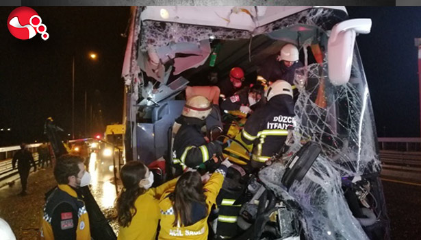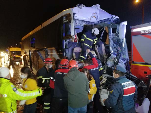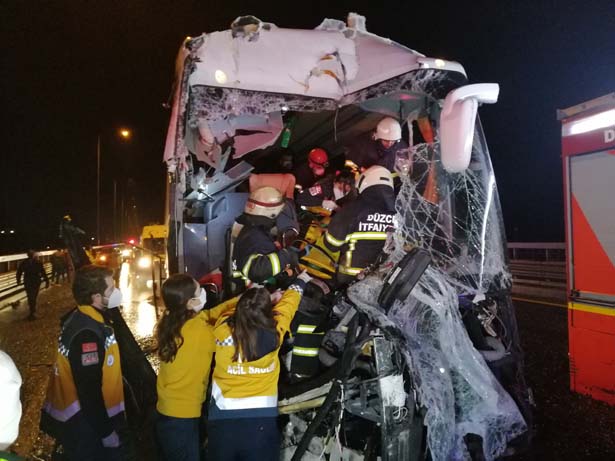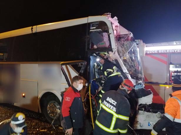 Kaza TEM Otoyolu Kaynaşlı ilçesi Bolu Dağı mevkisinde saat 05.00 sıralarında meydana geldi. İzmir Karabük seferini yapan Mehmet Ş. idaresindeki 45 HV 035 plakalı şehirlerarası yolcu otobüsü TEM otoyolu Bolu Dağı kesimine geldiğinde aynı istikamete gitmekte olan Sefa D.idaresindeki 41 F 2020 plakalı lastik yüklü kamyona arkadan çarptı. Çarpmanın etkisi ile otobüs şoförü ve muavin sıkıştı. Kazayı görenlerin haber vermesi üzerine olay yerine çok sayıda ambulans ve itfaiye ekipleri sevk edildi. Sıkışan muavin ve şoför Düzce Belediyesi İtfaiye Müdürlüğüne bağlı ekipler tarafından yoğun çalışma sonucu kurtarıldı. Sağlık ekipleri yaralı şoföre ilk müdahaleyi sıkıştı yerde yaparken otobüste yolcu olarak bulunan 14 kişi yaralandı. Yaralılar ambulanslarla çevredeki hastanelere sevk edilerek tedavi altına alındılar. Kaza nedeniyle tek şeritten veriler yol araçların yoldan kaldırılması ile tekrar trafiğe açıldı.