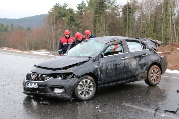 Zonguldak'ın Ereğli ilçesinde viraja hızlı giren sürücünün kullandığı otomobil yoldan çıktı. Taklalar atan otomobilde bulunan 4 kişi yaralandı. Yaralılar, olay yerine gelen sağlık ekiplerinin ilk müdahalesinin ardından Ereğli Devlet hastanesine kaldırıldı. Yaralılardan birisinin durumunun ağır olduğu öğrenildi.