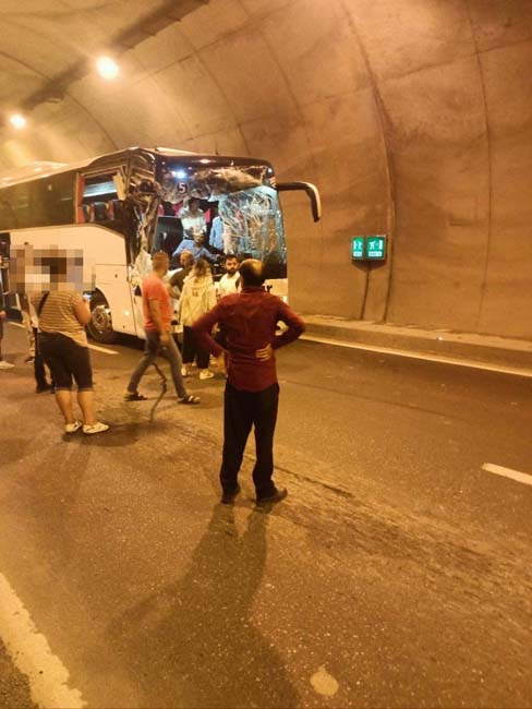 Zonguldak'ın Alaplı ilçesi ile Düzce'nin Akçakoca ilçeleri arasında bulunan tünellerde yolcu otobüsü kamyona arkadan çarptı. Kazada 2 kişi yaralanırken, şoka giren 2 kişi ise tedbir amaçlı hastaneye kaldırıldı.