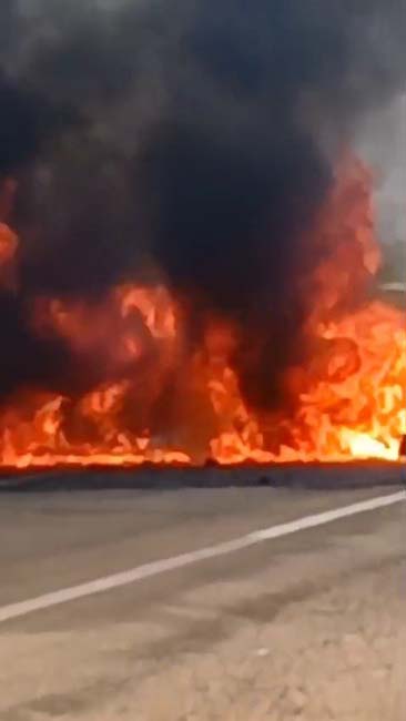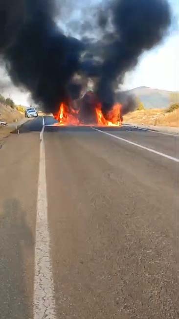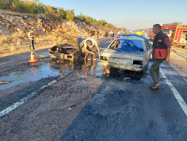 Karabük'ün Eflani ilçesinde 3 kişinin hayatını kaybettiği kazada kafaya kafaya çarpışan iki otomobilin alev aldığı anlar cep telefonuna yansıdı.