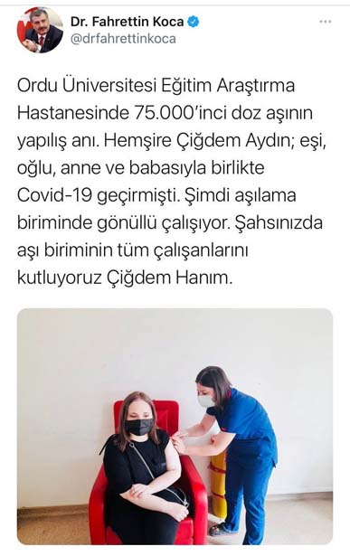Öte yandan Sağlık Bakanı Dr. Fahrettin Koca, dün akşam saatlerinde sosyal medya hesabından yaptığı paylaşımda, “Ordu Üniversitesi Eğitim Araştırma Hastanesinde 75 bininci doz aşının yapılış anı. Hemşire Çiğdem Aydın; eşi, oğlu, anne ve babasıyla birlikte Covid-19 geçirmişti. Şimdi aşılama biriminde gönüllü çalışıyor. Şahsınızda aşı biriminin tüm çalışanlarını kutluyoruz Çiğdem Hanım” ifadelerine yer vermişti.