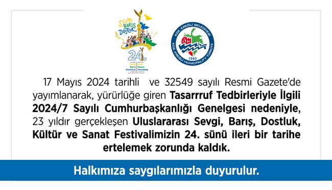 Kdz. Ereğli Belediyesi Başkanı Halil Posbıyık, makamında düzenlediği basın toplantısında 24. Sevgi, Barış, Dostluk Kültür ve Sanat Festivali’nin Cumhurbaşkanlığı Tasarruf Tedbirleri Genelgesi nedeniyle iptal edildiğini duyurdu.