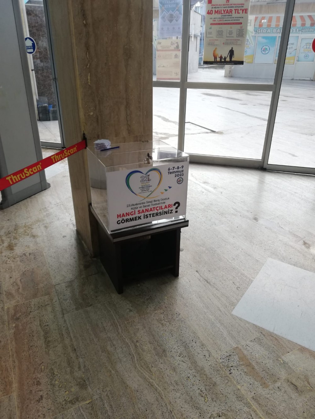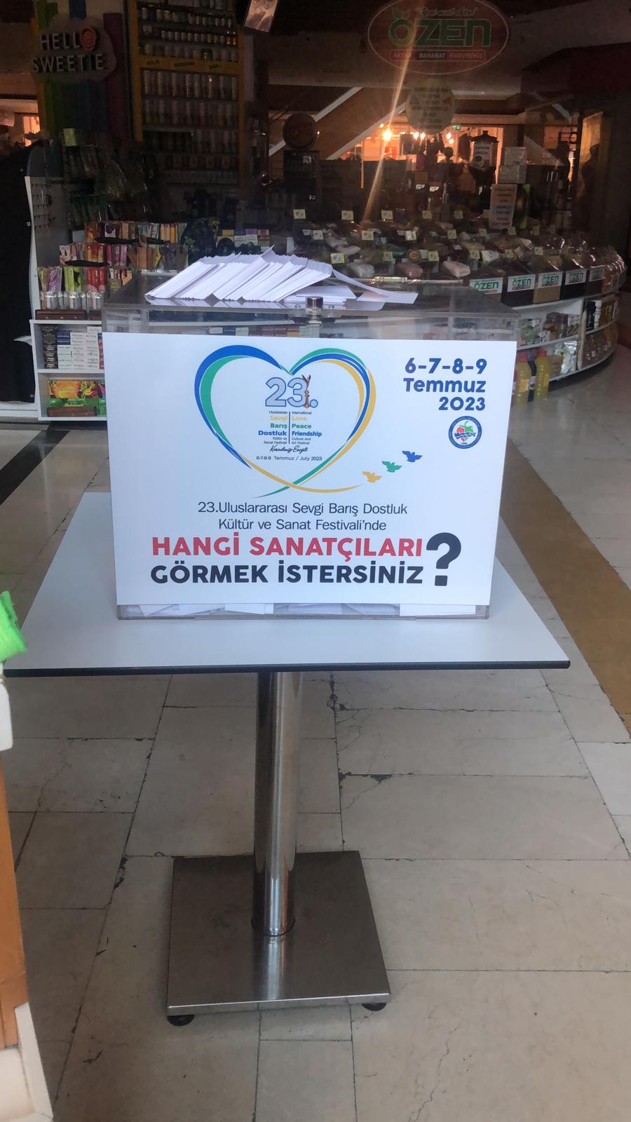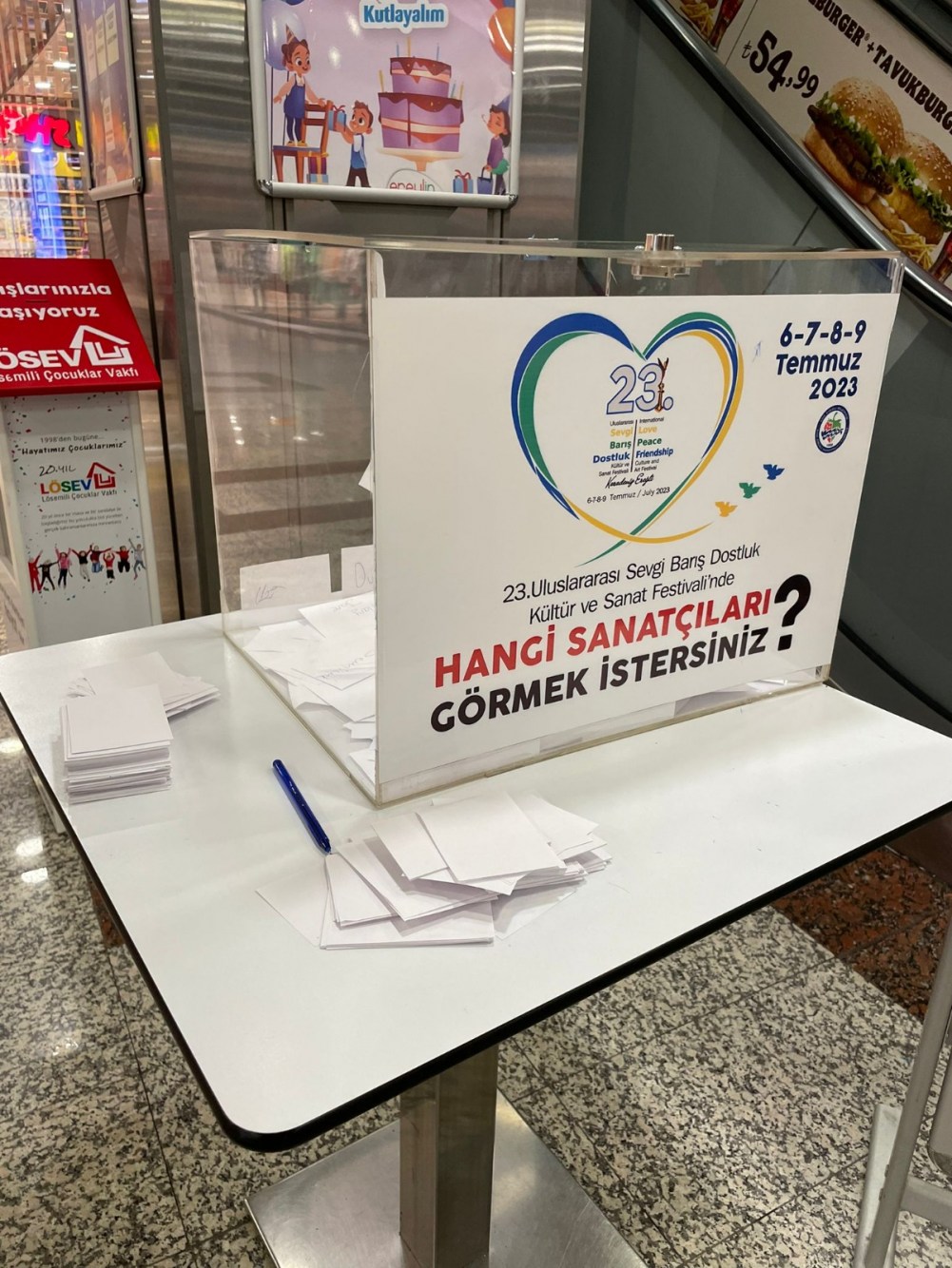 Belediye Başkanı Halil Posbıyık tarafından 6-7-8-9 Temmuz tarihlerinde yapılacağı açıklanan 23. Uluslararası Sevgi, Barış, Dostluk Kültür ve Sanat Festivali’ne katılacak sanatçıları belirlemek için halkın görüşleri alınacak. Bunun için ilçedeki Özdemirler AVM, Ereylin AVM, Halk Kafe ve Belediye girişine sandık konuldu.