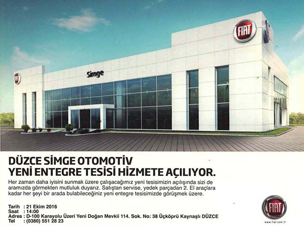 Düzce'de Fiat Simge Otomotiv alarak hizmet vermenin heyecanını yaşadıklarını belirten Yönetim Kurulu Başkanı Şemsi Durdu, 21 Ekim Cuma günü saat 14:00 yapılacak olan açılış törenine Zonguldak, Ereğli, Akçakoca, Düzce ve Bolu başta olmak üzere Fiat otomobil tutkunlarını davet etti.