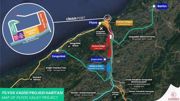Osmanlı Padişahı Sultan 2. Abdülhamid döneminde hayata geçirilmesi planlanan ancak günümüze kadar gerçekleştirilemeyen Filyos Projesi kapsamındaki 25 milyon ton kapasiteli Filyos Liman Projesi’nde sona yaklaşılıyor. Geçen Aralık ayında alt yapısının yüzde 90'ı tamamlanan Filyos Limanı, Karadeniz’in en nitelikli limanı olacak. Endüstri Bölgesi ilan edilen 23 bin dekarlık alanın önünde bulunan 25 milyon ton kapasiteli liman, kuzey-güney aksını da birbirine bağlamış olacak.