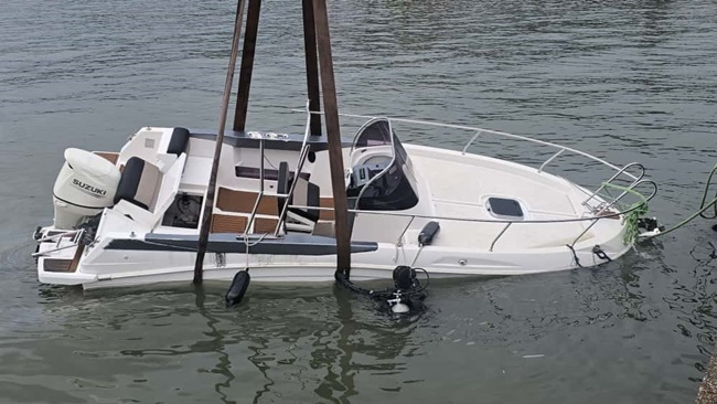 Fırtınada batan mini yat vinç yardımıyla karaya çıkarıldı